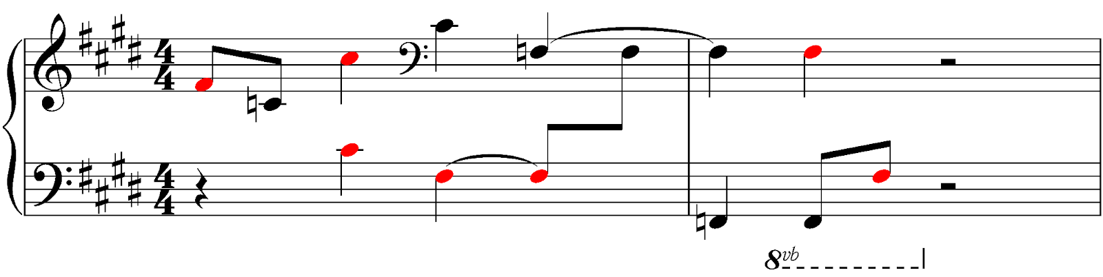 なお上の楽譜で、♯のときだけ赤く色をつけてみると、次のようになります。
