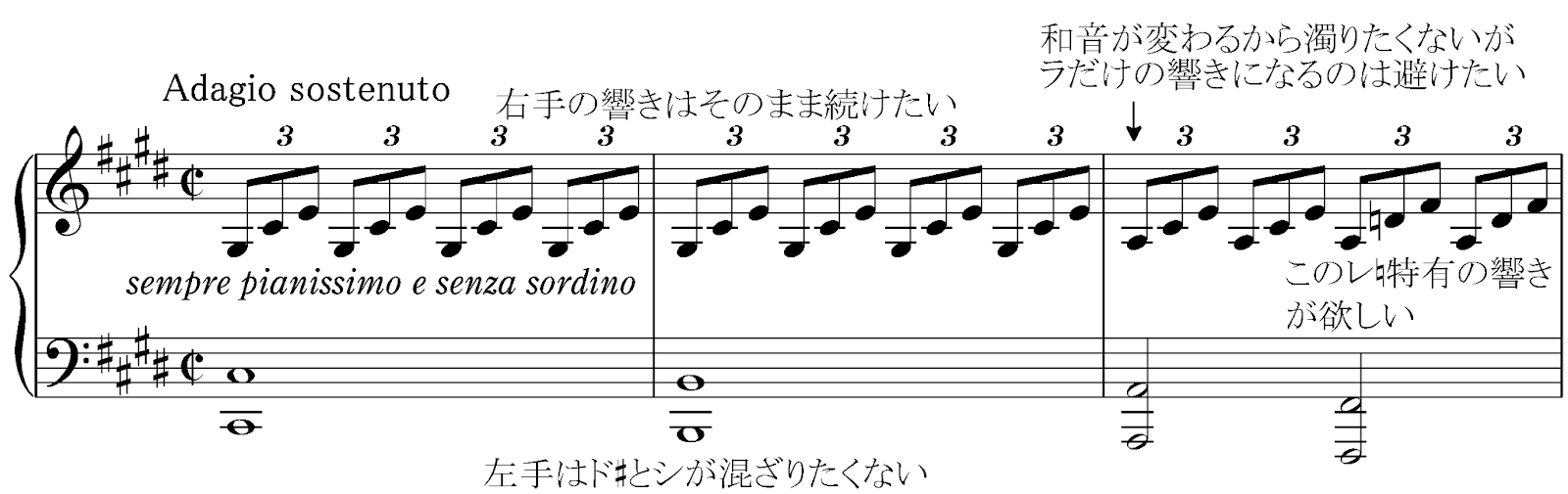 例えば、私は次のようなことを考えて冒頭の3小節のペダルを決めます。