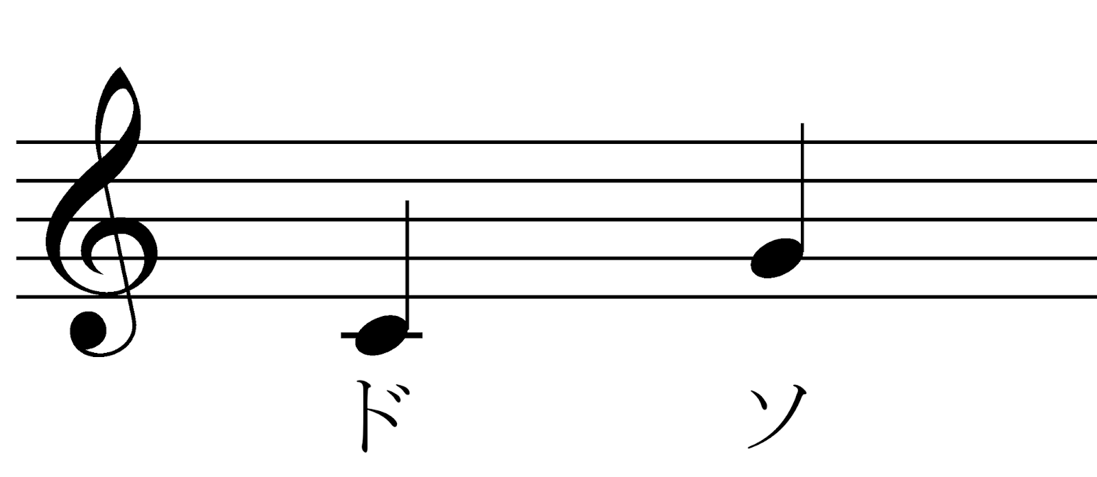 一番左にある魅力的な曲線を描いている記号を「ト音記号」と言いますが、今はこの記号は挨拶のようなものだと思ってもらって結構です。とにかく、ト音記号があれば、黒丸に横線が一本突き刺さった左側の音符が「ド」、右側の下から二番目の線の上に書かれた音符が「ソ」となります。