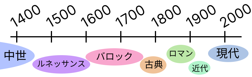 作曲年や、作曲家の国籍など、様々な情報はありますが、まずはこの時代区分を知ることが西洋音楽史の第一歩です!