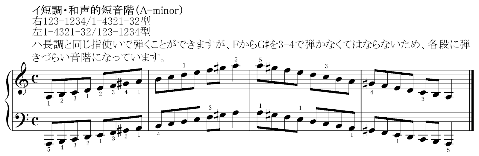 和声的短音階をスムーズに弾くコツは何と言っても増2度をどう処理するかです。指使いを想像してから弾くようにすることで弾きやすくなります。