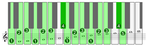 音階の原則5:黒鍵で始まる音階の右手の上りと左手の下りは2から始め、最初に出てくる白鍵を1にする