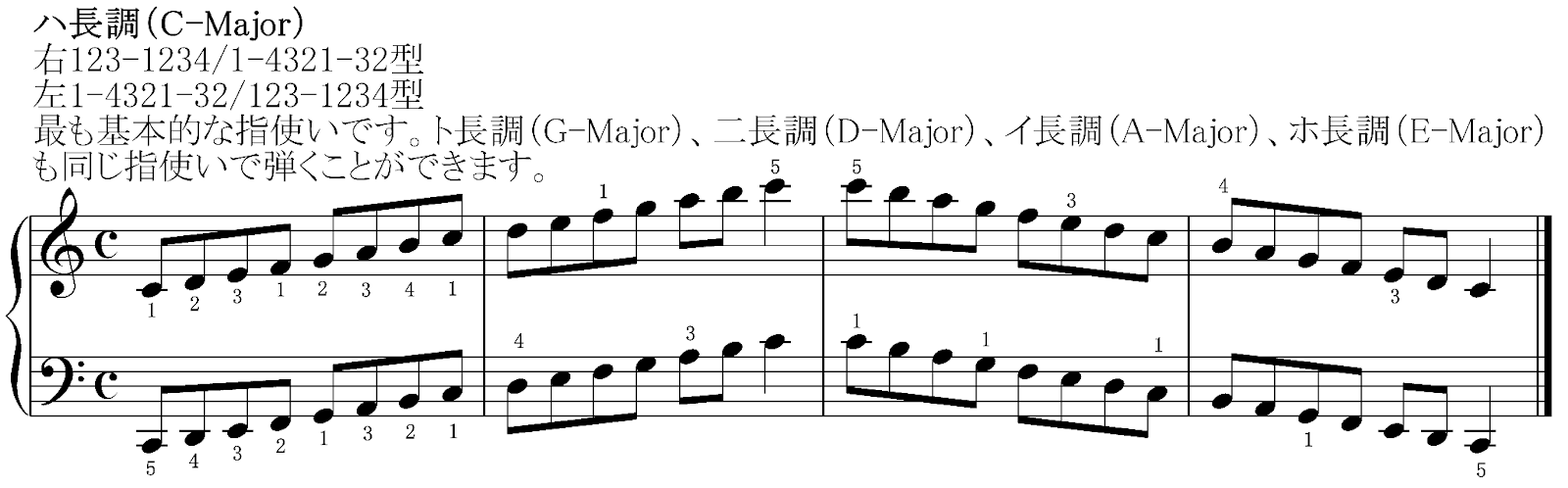 そんなハ長調の音階は、今後様々な音階を弾く上で重要なことをいくつも身に付けることができる大切な音階ですので、まずはこれを練習しましょう。