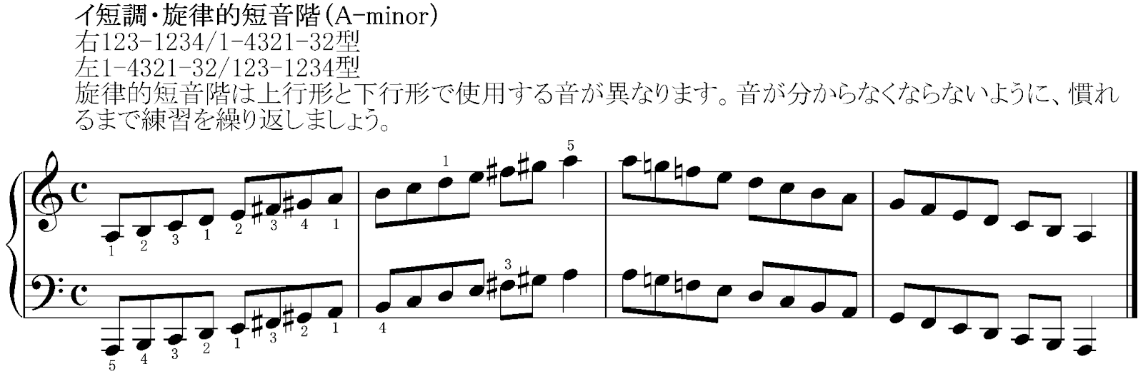 増2度がないため指にも馴染みやすい音階ですが、上りと下りで違う音階というのはクセが強いです。良く練習し、響きに慣れて、考えなくても弾けるようになるまで練習しましょう。