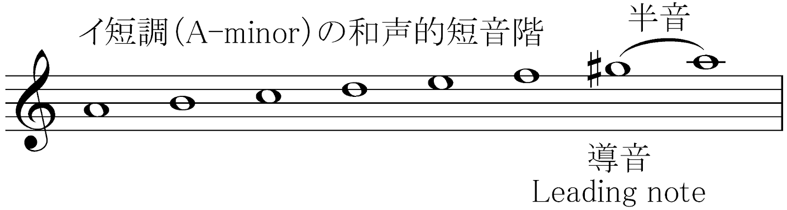 ところでハ長調の場合、シ→ドと主音(音階の始めの音)に上がるときに半音になります。これが主音の安定感をもたらしていますが、イ短調の場合、ソ→ラが全音なので、安定感が少なくなっています。そこで、ソに♯を付けて半音にします。このソ♯のことを導音と呼びます。このようにしてできた音階が和声的短音階です。