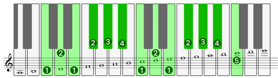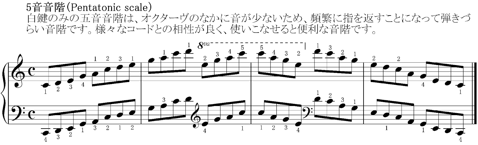 5音音階は様々な種類が有りますが、Cから始まるヨナ抜き(長調から第4音と第7音を抜いたもの)を弾いてみましょう。音階の原則1:オクターヴで指の繰り返しを考えると、音階の中に音が少ない5音音階は何度も指を返すことになり大変です。