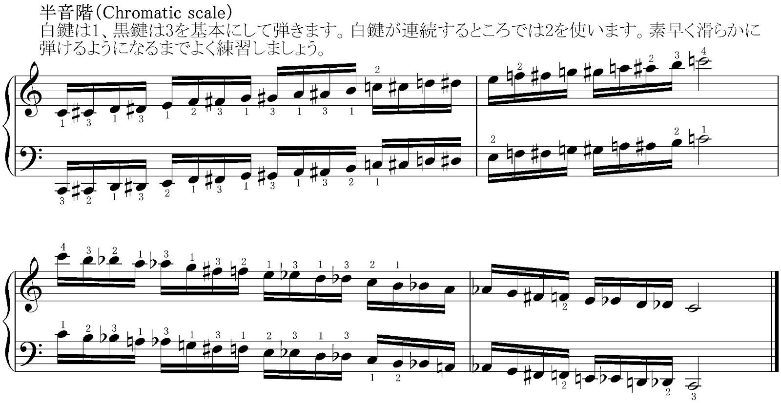 半音階は基本的に白鍵と黒鍵が交互に出てきます。そこで、白鍵は1、黒鍵は3を基本にして、白鍵が連続するところだけ2を使うように弾きます。非常に良く出てくる音階ですので、早めにこの感覚に慣れておきましょう。