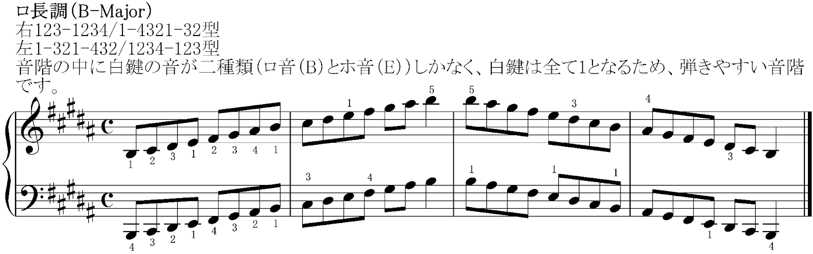 さて、黒鍵があると弾きやすいことを見てきましたが、ここで一気に全ての黒鍵を使ってみましょう。ロ長調は調号に♯が5つもついていて、白鍵2つと黒鍵5つという音階になっています。調号が多くて読みづらかったり、黒鍵は小さいためミスタッチをしやすくなる、ということはありますが、手が鍵盤に綺麗にフィットするため、感覚を掴むと最も弾きやすい音階となります。
