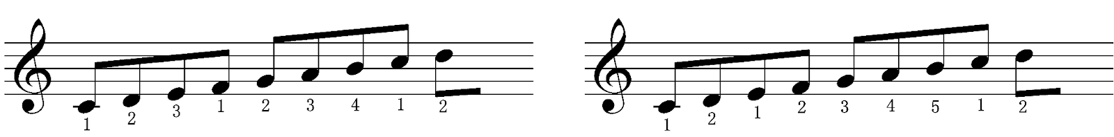試しに、ドレミファソラシドを123-1234-1と、12-12345-1で弾き比べてみましょう。弾きやすさに大きな違いがあるはずです。
