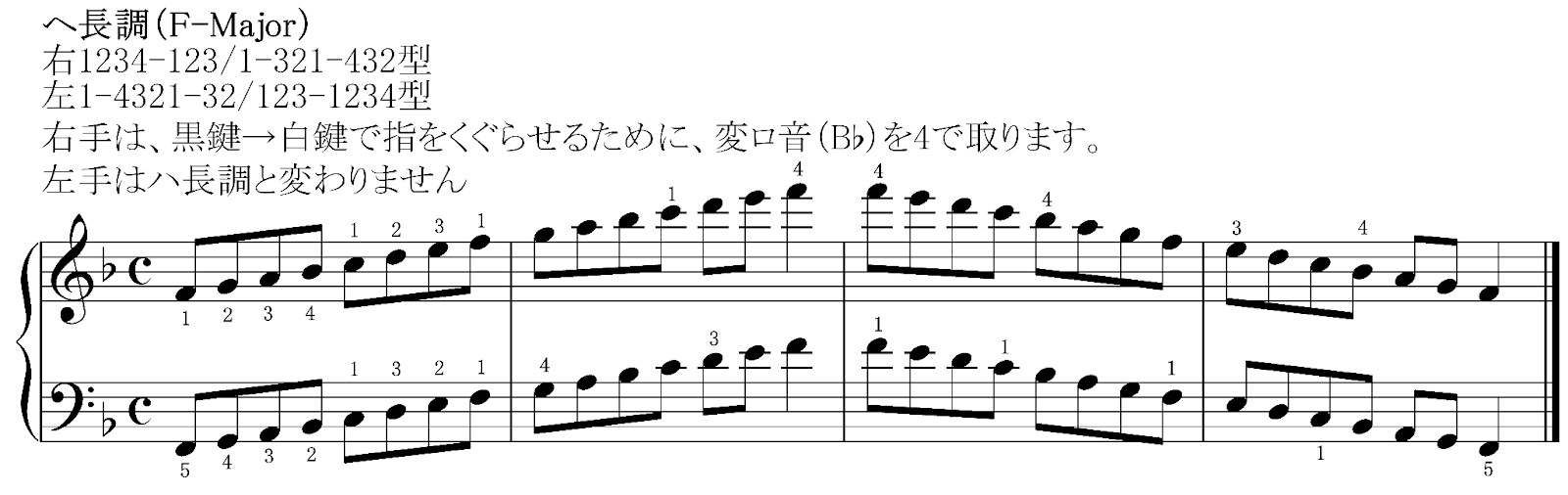 ヘ長調(F-Major)の音階は、左手はハ長調の時と全く変わりませんが、右手は1234-123という指使いになり、指を返すタイミングがハ長調の時と異なります。この指使いになると逆に右手と左手で常に親指を使うタイミングが揃うので、ハ長調よりむしろ簡単になります。