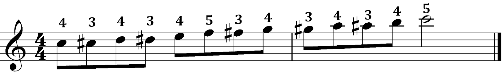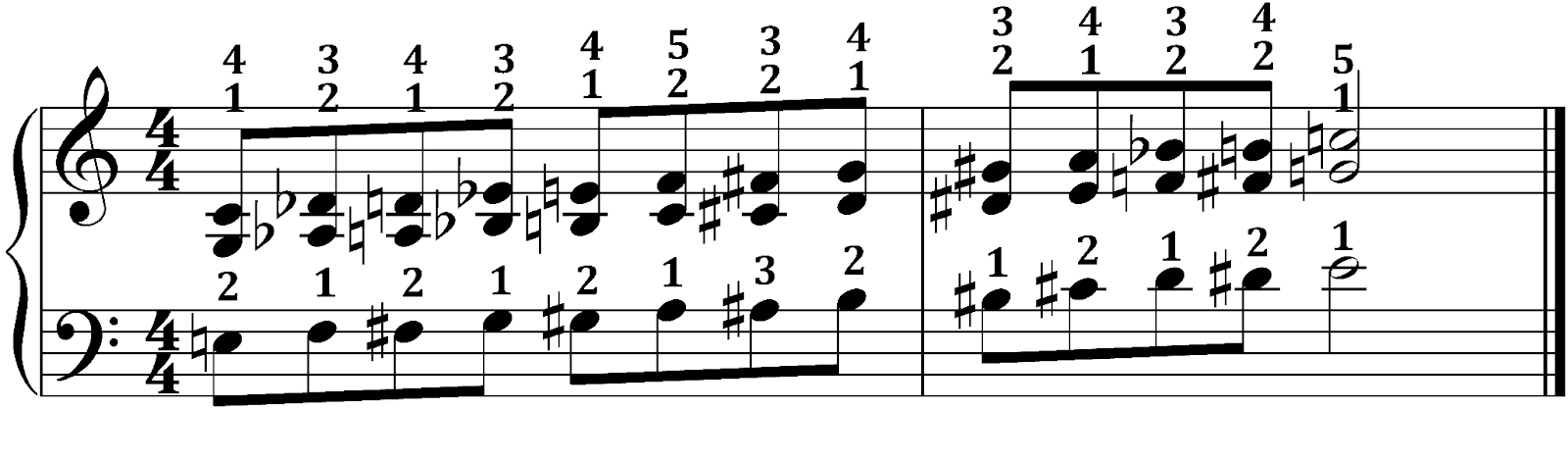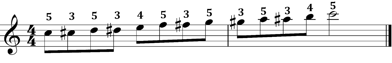 1-2-3の指で弾くのが半音階の基本ですが、そのほかの指使いでも弾くことができます。3-4-5は、ピアノが半音階を弾くために出来ているのではないか、と思える理由にもなる指使いです。3-4-5のみで半音階を弾くことができると、1と2の指が空くため、半音階と同時に旋律を弾いたり和音を弾いたりすることができるようになります。