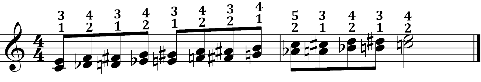 3-4-5の指で半音階が弾けるようになったら挑戦したいのが、片手だけで和音の半音階を弾くことです。