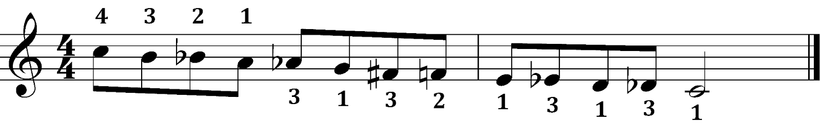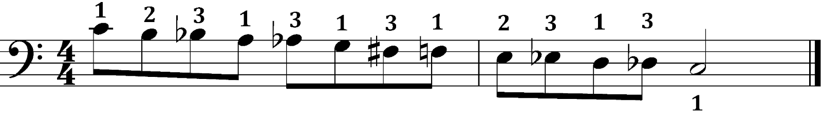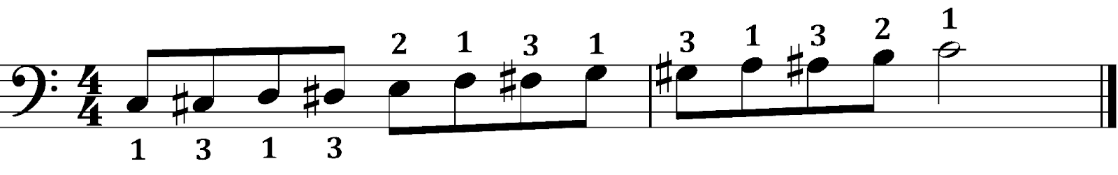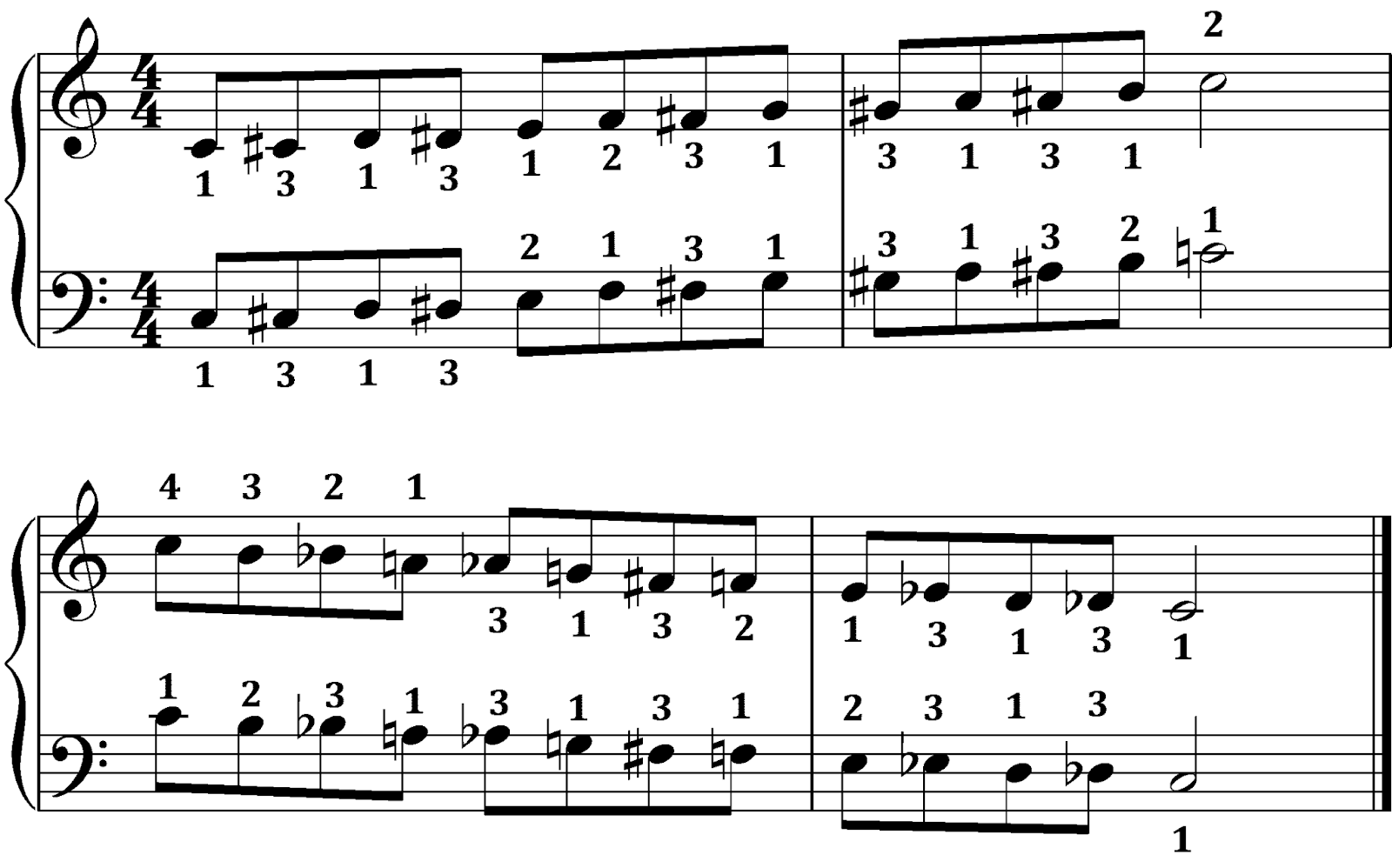 1-3の指使いで弾く半音階は弾きやすく、一つ一つの音をしっかり鳴らすことができますので、最も大切な指使いですが、一方で同じ指を何度も使うため、レガートはしづらいです。究極のレガートを目指す指使いを研究してみましょう。