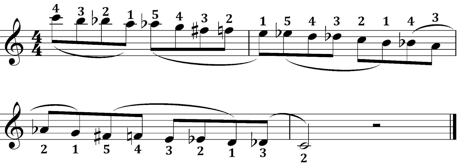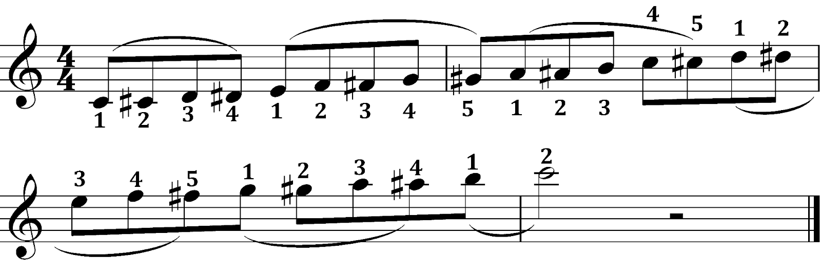 まずは楽譜通りの指使いを試すのが良いと思いますが、楽譜や常識にとらわれずに、自分にとって合理的な指使いを見つけていきましょう。とくに半音階は本当に多く指使いの可能性がありますので、ぜひ研究してみてください。