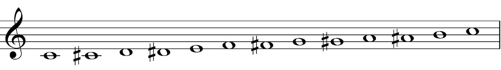 まず、「半音階」について説明します。英語では「Chromatic scale(クロマティックスケール)」と言い、1オクターヴ中の12個全ての音から成る音階です。ピアノの鍵盤を全部順番に押していけば、半音階のできあがりです。