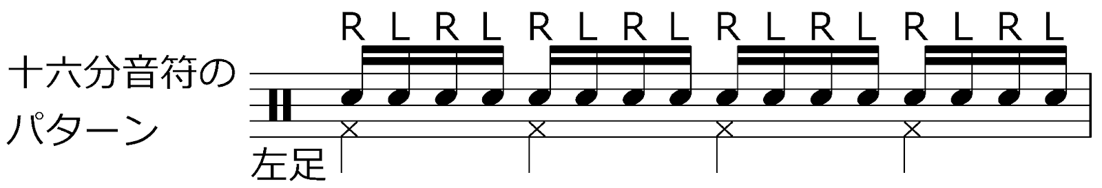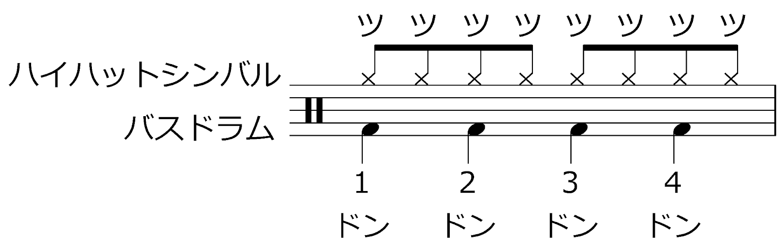 この譜面を見たとき、「8ビートだから、1小節で右手は8分音符で刻んで、バスドラムは4音符で1拍目と3拍目と……」という感じで考えてしまうと、難しくなってしまいます。