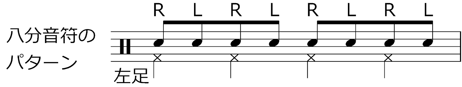 右からスタートした場合、8分音符であれば『左足を下ろす時と右手』が一緒になります。