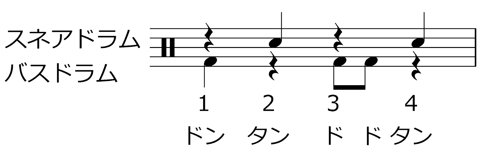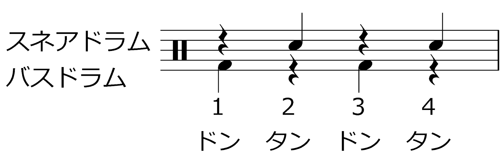 そして、ドラムを叩く前に「ドンタンドンタン」のように口でリズムを取ると、演奏が簡単になります。