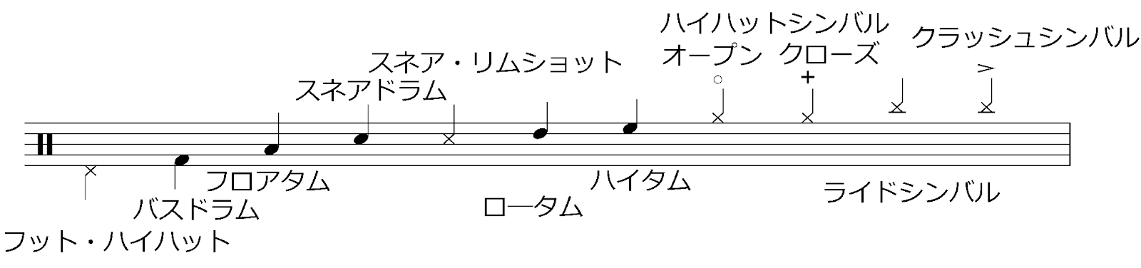 ドラムも、五線譜に音符を書いて楽譜を作りますが、他の多くの楽器と違い、音符の高さは楽器を表します。