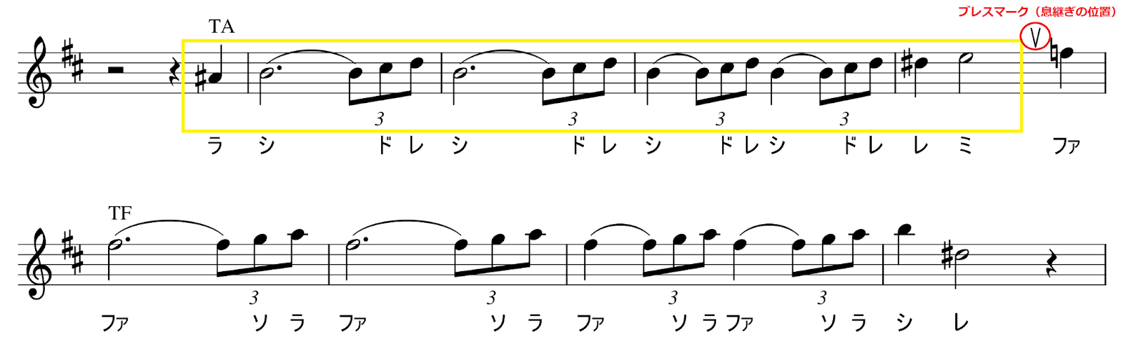 メロディーは文章に似ています。言葉や意味のまとまりを考えて自然な位置で息継ぎをするのがセオリーです。この楽譜では黄色で囲まれた部分が1つのフレーズのまとまりなので、この部分は一息で演奏したいですね!このように、どこまでを一息で吹くかをあらかじめチェックしておくことが①計画的に息を使うために必要なプロセスです。この楽曲はゆったりしたテンポなので、浅いブレスでは4小節間を吹き切るのが難しいでしょう。さらに一息で吹き切るために、吹き始めのときに音量を大きくしすぎないこともポイントです。