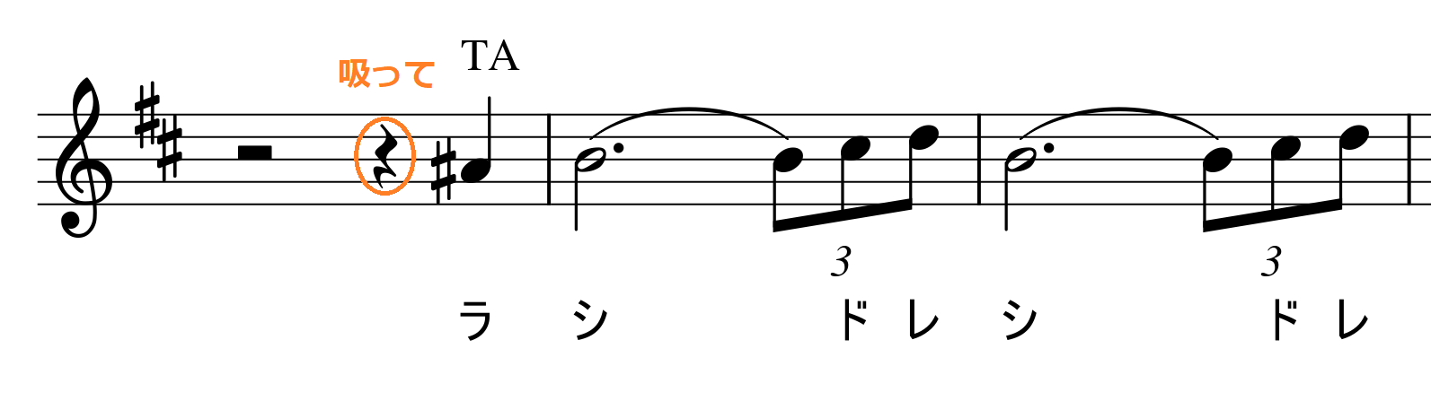 フレーズとブレスの位置を確認したら、次は②しっかりと息が吸えているかみていきましょう。楽譜に赤で示したところで息を吸うのが一般的ですが、それはほとんどの方が実践できていると思います。しっかり息が吸えるかどうかを決めるのは、実はこれより前の部分にポイントがあります。