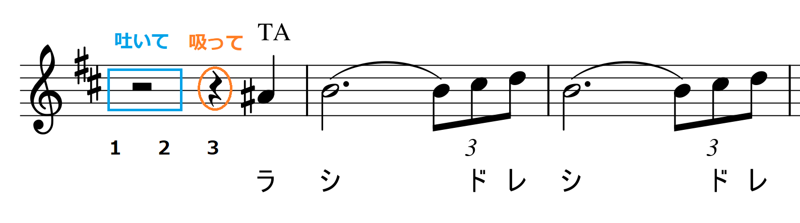 重要なポイントとなるのは、吸う前にしっかり吐いておくということです!青で示した息を吸う前の2拍分で、しっかりお腹の息を吐き切ってから息を吸ってみましょう。吐くことを意識する前より、自然と吸える息の量が多くなっているはずです。人間は体の構造上息が残っているとしっかり吸うことができないので、息をたくさん吸うことよりもしっかり吐き切ることを意識してみてください。