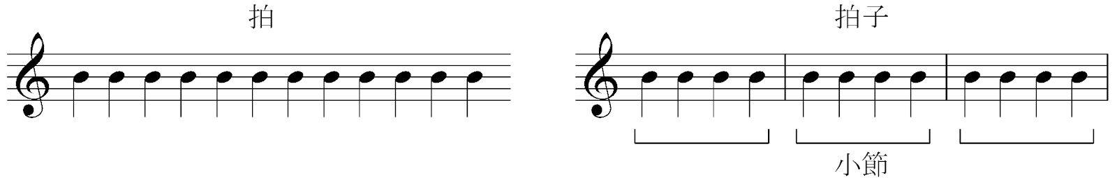 拍子とは、拍が集まってグループ化したものです。楽譜に書くときは、グループ化したものを小節としてひとまとまりにします。