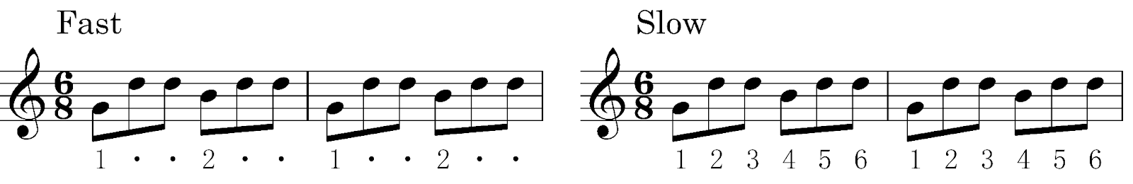 一般的には、強拍を1拍目、弱拍を2拍目と呼び、1、2、1、2とカウントします。なぜなら6/8拍子は2拍子の各拍を3分割したものだからです。しかし、ゆっくりな曲であれば、1、2、3、4、5、6とカウントします。