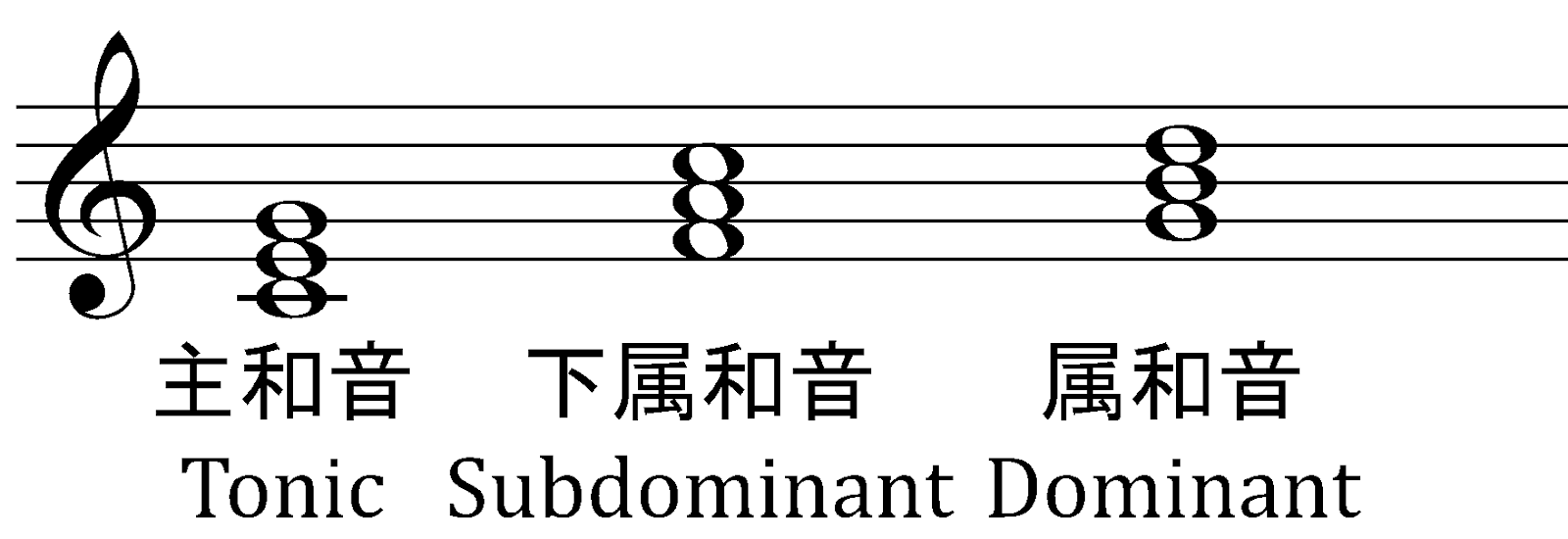 トニック・サブドミナント・ドミナントという英語由来のこれらの言葉は、和音(の機能)の名称として使われることがあります。この場合、日本語ではそれぞれ主和音、下属和音、属和音と呼びますが、英語名称のほうがよく使われます。
