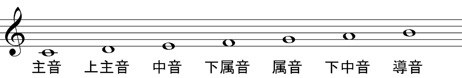 これらの名称は、調の中でどのような機能を持っているか、を表しています。機能に関しては少し難しいのでここでは説明を省きますが、主音と属音が調の軸となり、この二つの音が長調だったり短調だったりの大黒柱になるわけです。下属音も、調を形作る上で大切な働きをしています。なお、英語バージョンも一応載せておきます。
