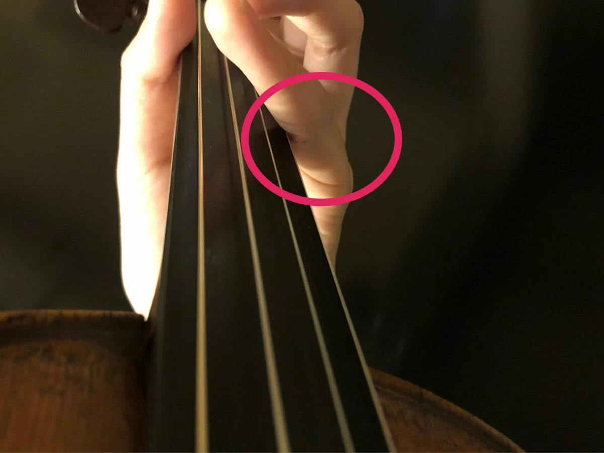 指を押さえているポイントで、弦が指板にちゃんとくっつくまで強く押さえましょう。