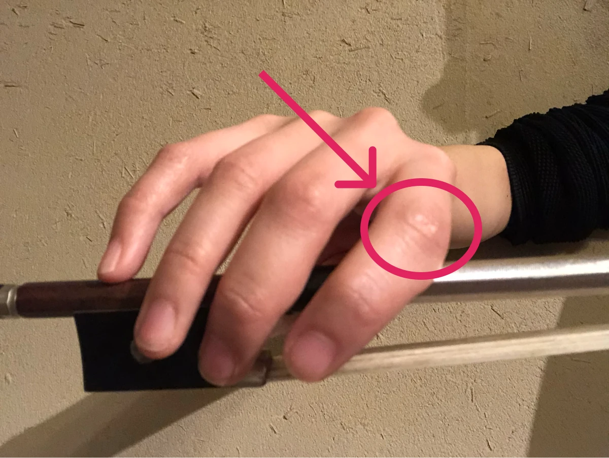 コツは、右手の人差し指が弓に当たっている所(第2関節あたり)に腕の重さを乗せること。