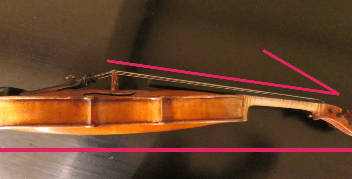 仮に楽器を床と平行に構えることが出来たとしても、必ず弦は下降しています。