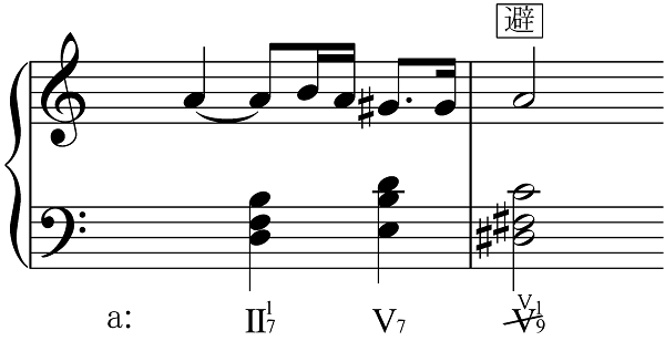 偽終止というと、通常II→V→VIのみを指しますが、VIではなくV度調のV、いわゆるドッペルドミナントなど他の和音を使うことがあります。このように、全終止のIを他の和音に置き換えた終止のうち、名前がついていない終止を避終止と呼ぶことにしましょう。これは筆者の造語です。フランス語では名称があり、「cadence evitée」といいます。これは直訳すると、「避けられたカデンツ」となります。