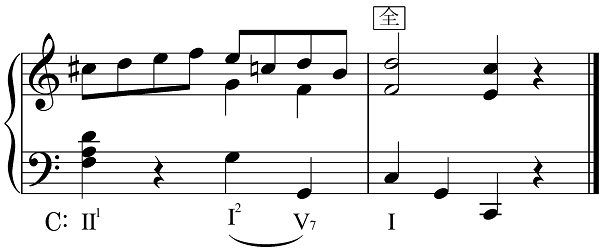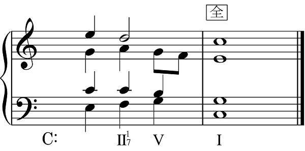 もっとも基本的な終止形で、II→V→Iと進み、強い終止感をもたらします。オーケストラで演奏される場合は、IIが不安定な響きのため、V→Iのみで全終止を作る場合もあります。曲の最後だったり、セクションの終わりによく用いられます。バロック時代に登場し、時代が進むにつれて全終止もさまざまな姿を見せていくことになります。全終止の歴史はそのまま調性音楽の歴史といってもいいかもしれません。