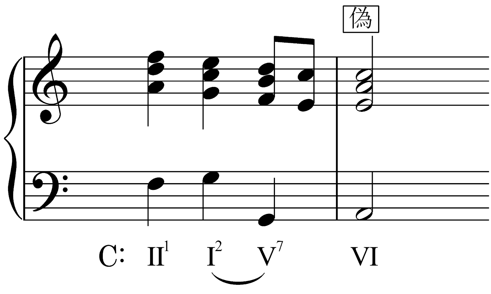 全終止のII→V→Iを避け、II→V→VIと進む終止形を偽終止と呼びます。II→Vと進んだ段階で、Iを期待しますが、それを裏切ってVIに進むことで意外感をもたらします。また偽終止の後に変終止を持ってくることも可能で、そうするとV→Iの進行を使うことなく曲を閉じることができ、高級感のある進行となります。