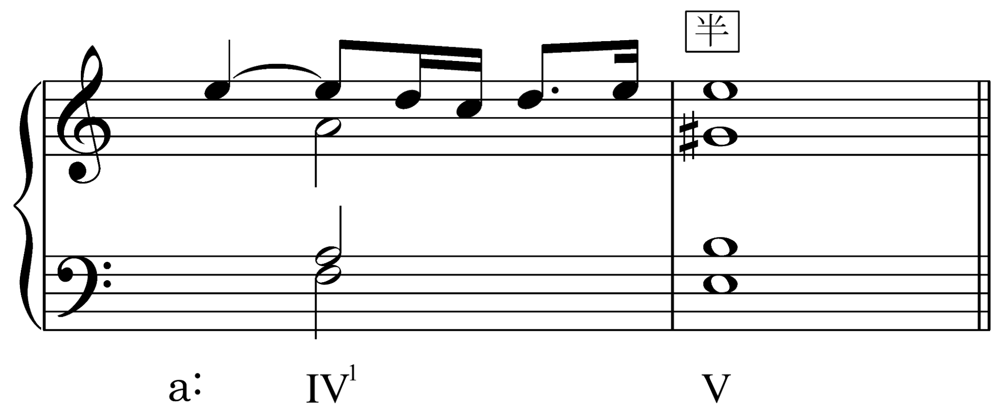 これも基本的な終止形で、II→VあるいはIV→Vと進みます。セクションの区切りを付けますが、終止感というよりかは、その後の展開を期待させる効果を持ちます。