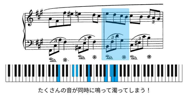 たとえば、ショパンのノクターン14番は、左手が広い和音のアルペジオで、右手は流れるような旋律になっています。左手のアルペジオにはペダルをかけたいですが、踏み続けてしまうと右手が濁ってしまいます。