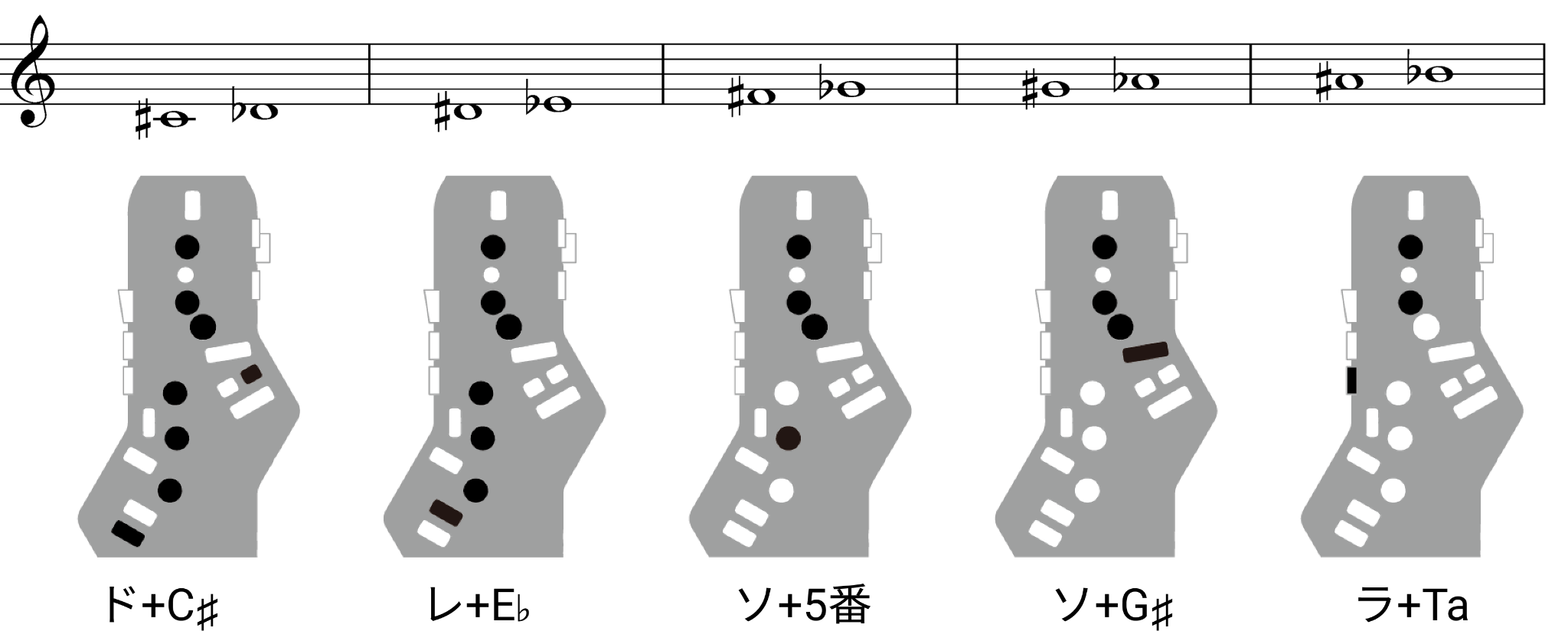 例えば、ソを吹いているときに5番を押すと半音下がり、G#キーを押すと半音上がるんだな、と覚えると、比較的スムーズに身についてくるはずです。