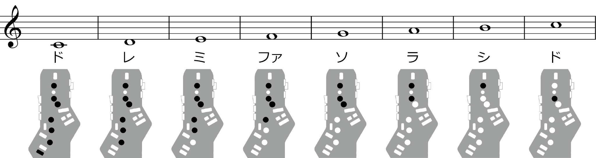 ここまで、ドからドまでの8つの音を練習してきましたが、左手親指のオクターヴキーを使うだけで、一気に音域を倍に広げることができます!レからドの音それぞれに、オクターヴキーを付け加えて吹いてみましょう。