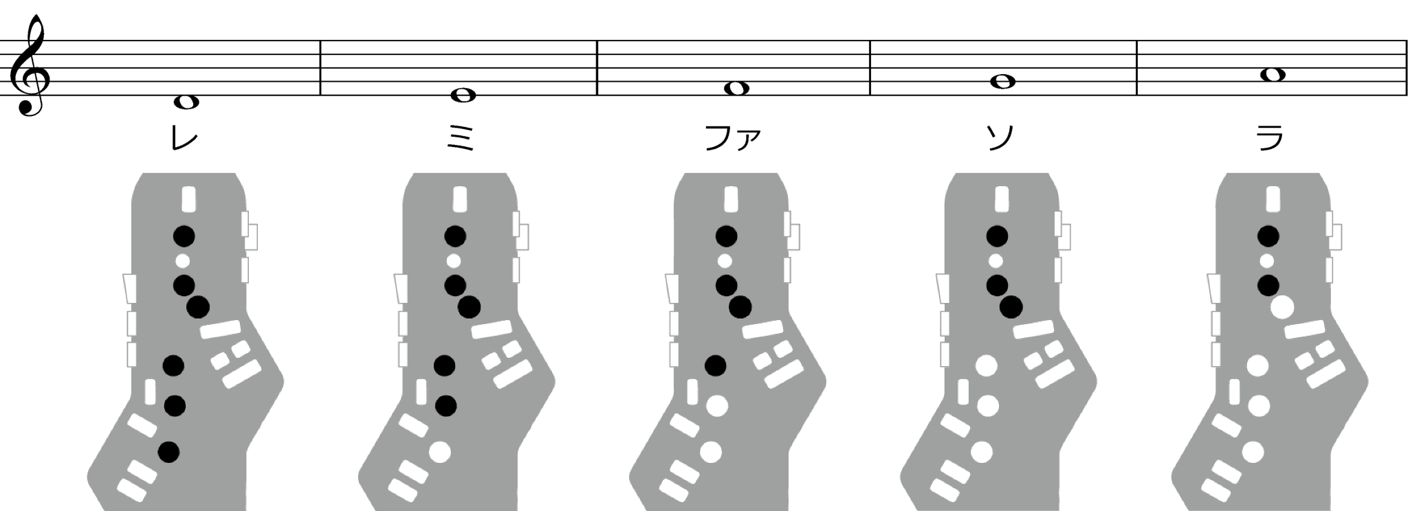 ここから、指を上から順番にひとつずつ下ろしていきましょう。ラ・ソ・ファ・ミ・レまでの音は出ましたね。