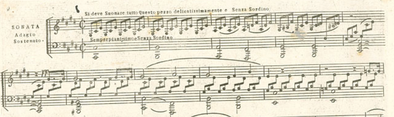 初版の譜面を見てみると上に「Si deve Suonare tutto questo pezzo dilicatissimamente e Senza Sordino」と書かれています。