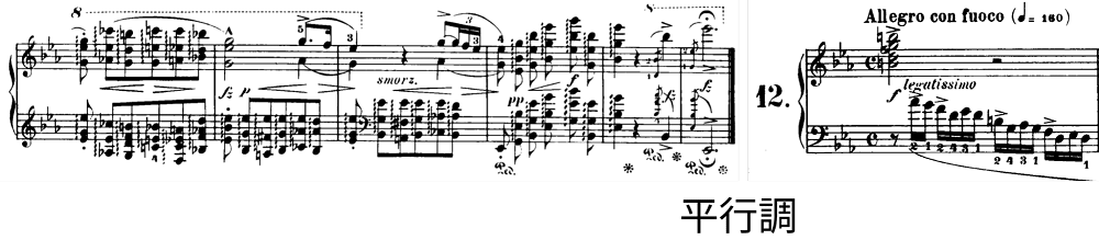 11番から12番に関しては少し特殊で、唐突な印象を受けます。平行調ではありますが、11番の最後の変ホ長調の主和音から、ハ短調への属七はあまり自然な繋がりではありません。