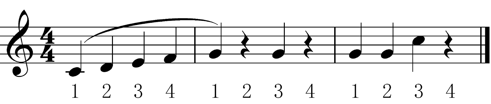 それでは、この休符を使った楽譜を読んでみましょう。全ての音符と休符が同じ長さで進んでいきますので、リズムが分からないという場合は、一定のテンポで、指で机を叩くなどして刻んでいきましょう。