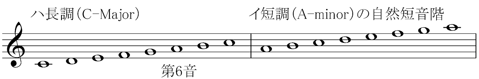 まず、ハ長調(C-Major)の音階の第6音から音階を作るとイ短調(A-minor)の自然短音階ができあがります。