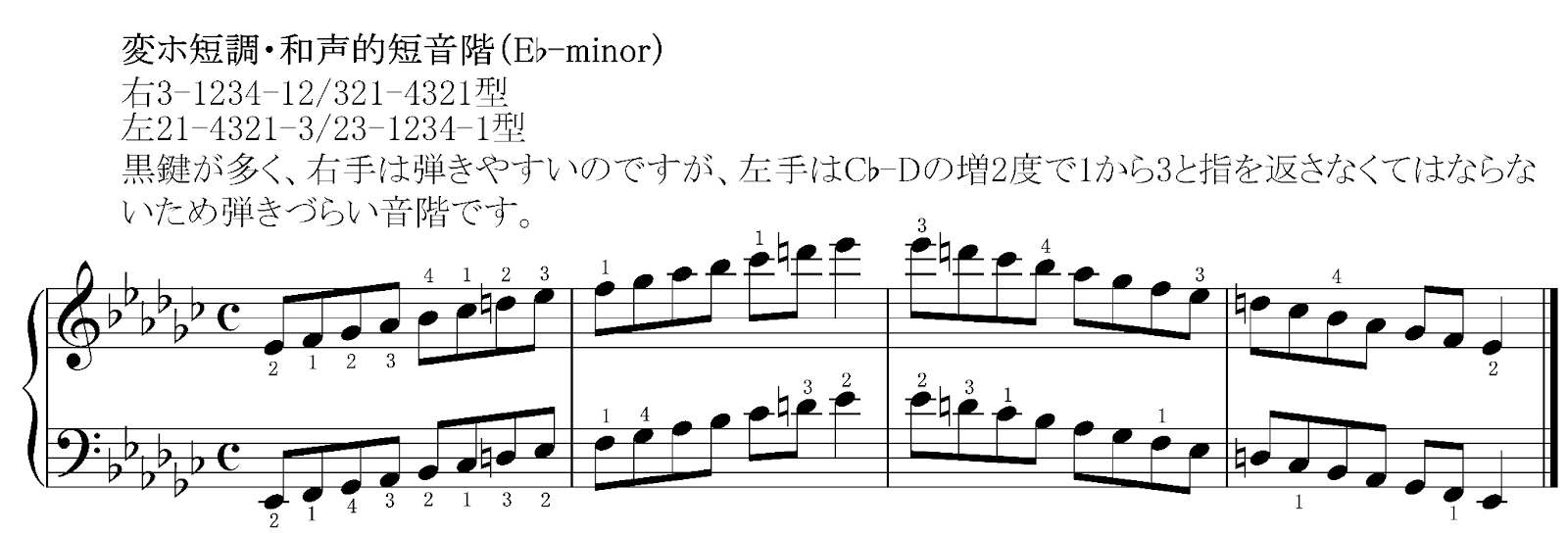 例外:変ホ短調(E♭-minor)は黒鍵が3つ連続した後に増2度があるため、左手はどうしてもこの増2度で指を返すことになります