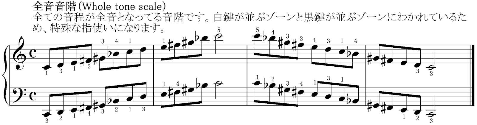 全音音階は全ての音程が全音となっている音階のことで、ドビュッシーが多用しているほか、ジャズでもよく使われます。Cから始まる白鍵3つ・黒鍵3つのパターンと、C♯から始まる白鍵4つ・黒鍵2つのパターンがあります。白鍵4つ・黒鍵2のパターンは、123-123-と繰り返すだけで弾けますが、白鍵3つ・黒鍵3つのパターンは、13-1234(または12-1234)というアンバランスな形で弾かなくてはいけません。