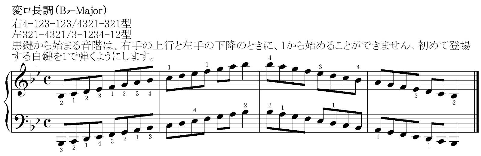 変ロ長調は始めの音が黒鍵でしたが、2つめの音は白鍵でした。そのため、21でスタートします。その他、変イ長調(A♭-Major)・変二長調(D♭-Major)は始めの2音が黒鍵となり、231でスタートします。変ト長調(G♭-Major)は始めの3音が黒鍵となりますので、2341でスタートします。これは「音階の原則3:黒鍵→白鍵または白鍵→黒鍵のときに指を返す」が身についていると、自然とできるようになります。