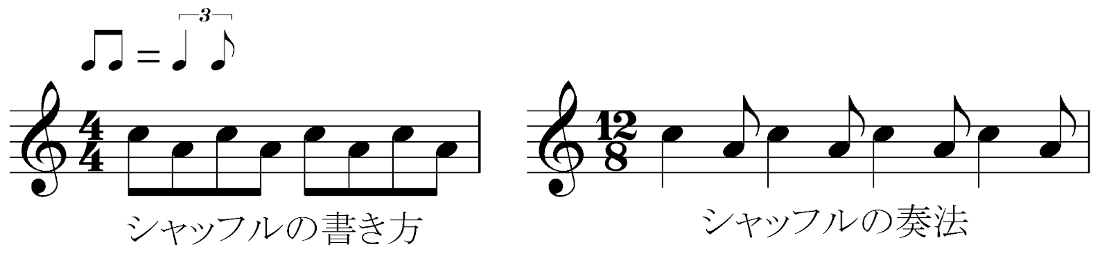 A. シャッフルは均等な4拍子の各拍を2:1に分割するリズムのことで、12/8拍子の一種です。スイング4拍子すら不均等であることがあり、また各拍の分割も様々です。
