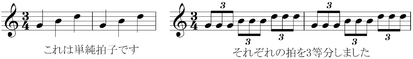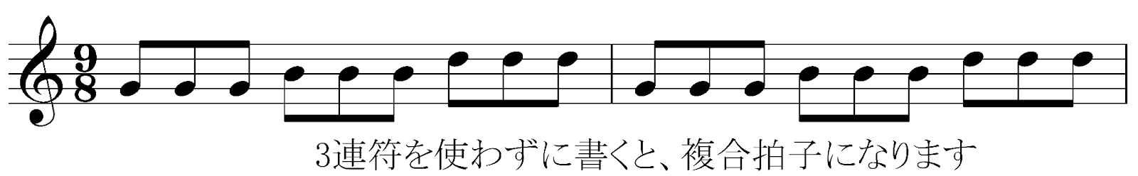 たとえば、3/4拍子の1拍を3分割して、9/8拍子という複合拍子を作ることができます。